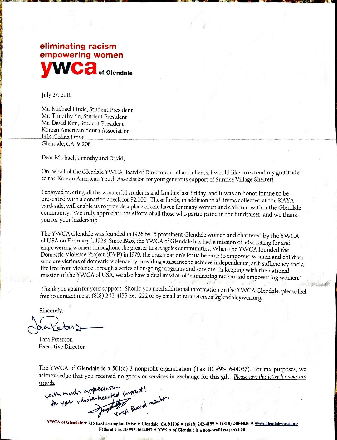 YWCA Glendale Appreciation Letter
